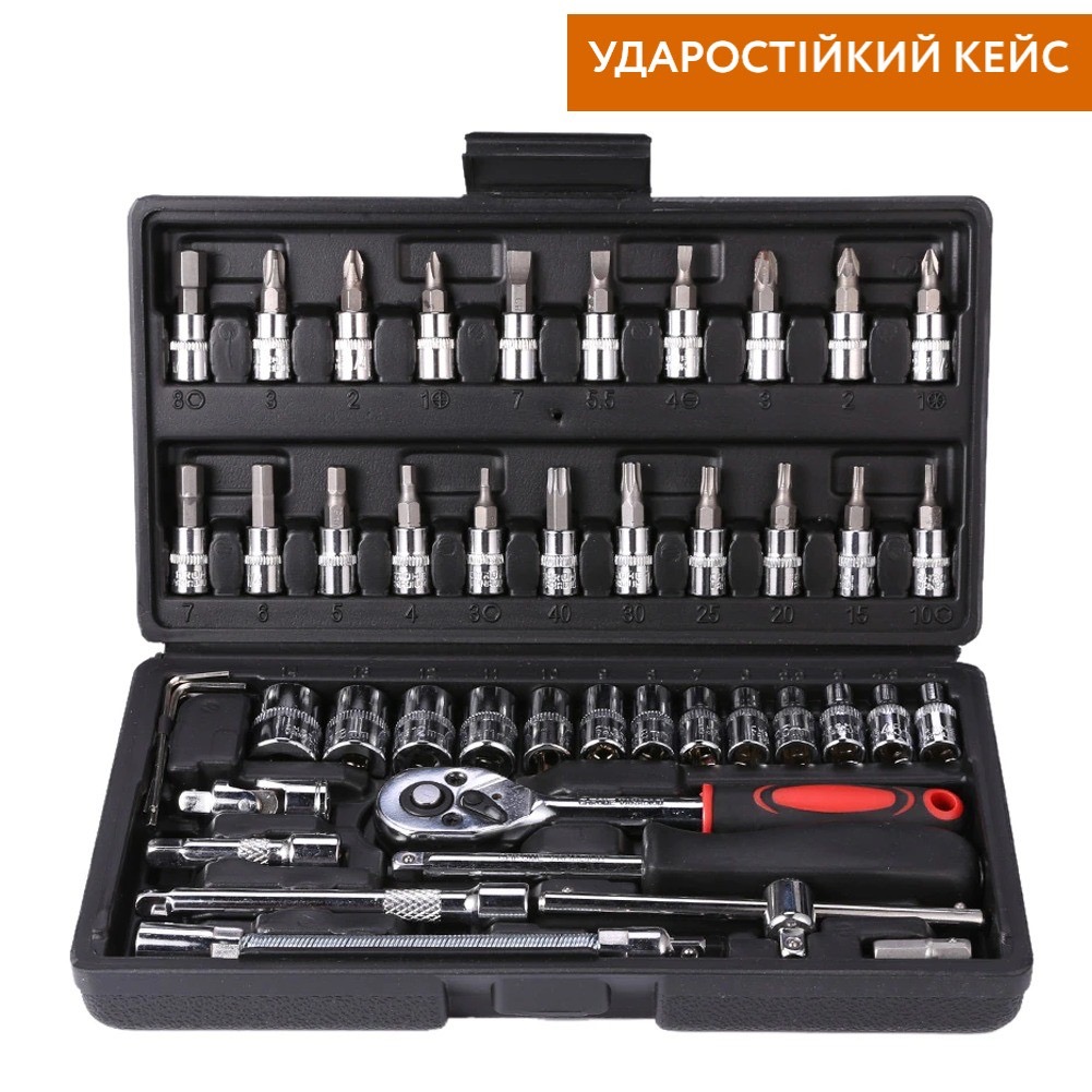 Набір інструментів в кейсі на 46 деталей (викрутка, тріскачковий ключ, головки торцеві, шестигранники)