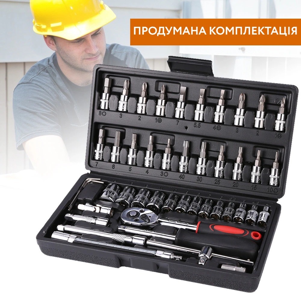 Набір інструментів 46 елементів має бути в арсеналі будь-якого чоловіка. У його комплекті йде тріскачка, викрутка та безліч різних біт та торцевих головок. Набір упакований у міцний пластиковий кейс, в якому зручно його транспортувати. Зручний та компактний набір інструментів 46 елементів зроблений із міцної хромованої сталі, яка витримує небувалі навантаження. Зручні пластикові ручки на тріскачці та викрутці дозволяють інструментом зручно триматися в руці. У цьому наборі ви знайдете безліч різних бітів, головок і навіть шестигранних ключів, які допоможуть відремонтувати техніку, як в будинку, так і в авто. Всі інструменти поміщені в компактний пластиковий кейс, який дуже зручно та практично брати з собою у дорогу, просто поклавши його у багажник