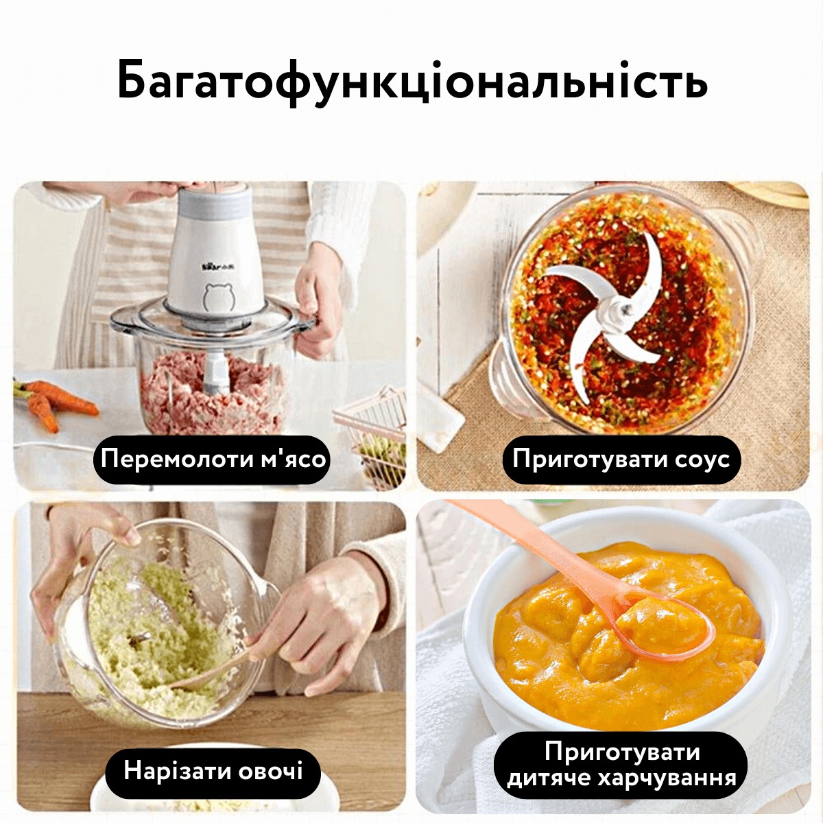 Призначення: для подрібнення, для приготування фаршу, для змішування, для шинкування овочів і фруктів