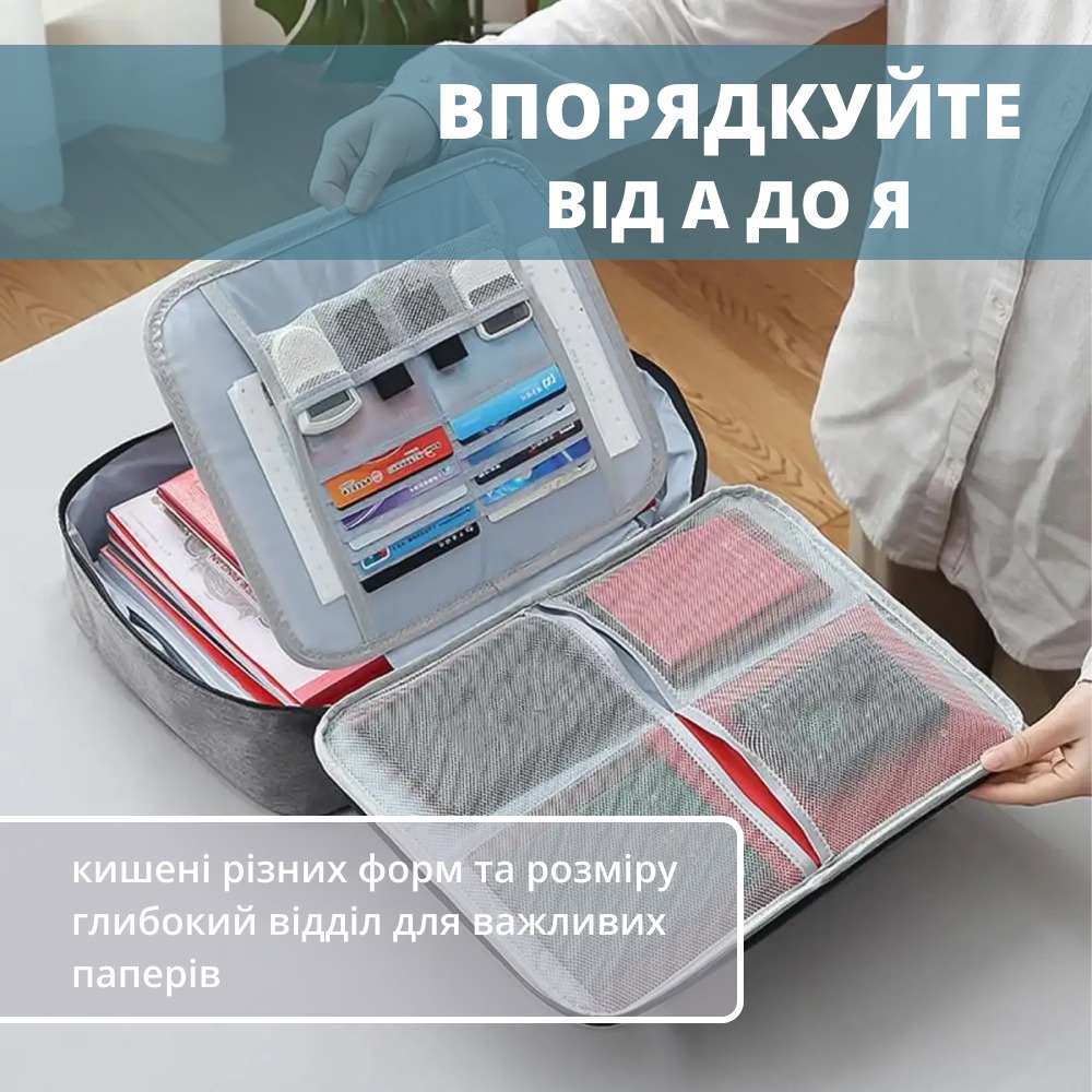 Сумка-органайзер для подорожей з кодовим замком є відмінним варіантом для впорядкування та захисту важливих документів як під час подорожей, так і вдома. Вона водночас компактна та містка - її простору достатньо для організованого зберігання паспортів, квитків, грошей та інших необхідних речей.