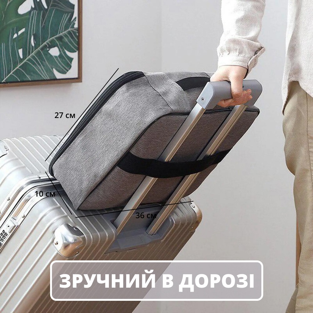 Органайзер складається з одного просторого відділу та декількох роздільників з кишенями різних розміру та форми. Це дозволяє легко впорядковувати предмети й забезпечує швидкий доступ до них. Виготовлена з водостійкого матеріалу, сумка легка та невелика, а гумова ручка дозволяє закріпити її на валізі, для легшого транспортування.
