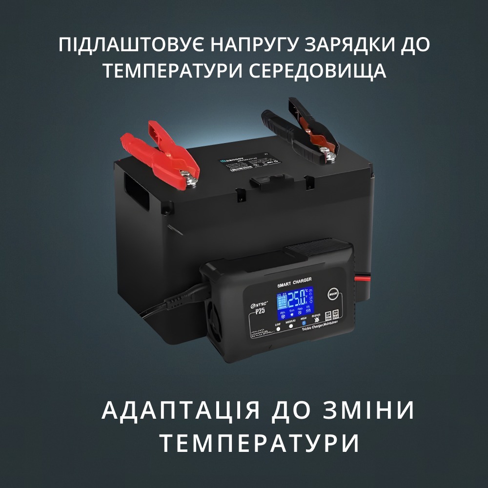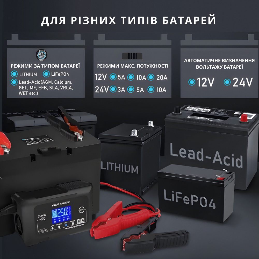- Підходить для літієвих і свинцево-кислотних акумуляторів; Зарядний струм до 15 А для швидкого та ефективного заряджання;