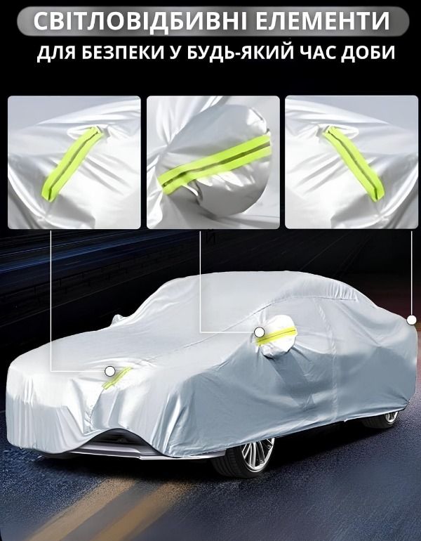 Цей чохол для вашого автомобіля — ідеальне поєднання стилю, практичності та захисту. Його продуманий дизайн забезпечує надійний захист від пилу, дощу та сонячних променів, при цьому підкреслює вашу індивідуальність і увагу до деталей. Кожен автолюбитель прагне зберегти свій автомобіль у відмінному стані як зовні, так і всередині. Світловідбивні смужки, вбудовані в чохол, не тільки додають йому стильного вигляду, але й підвищують безпеку, адже важливо, щоб ваш автомобіль був помітний у будь-який час доби, особливо в умовах обмеженої видимості. Цей чохол стане надійним захистом для вашого автомобіля, а також стильним аксесуаром, який підкреслить вашу турботу про нього і виділить вас серед інших.