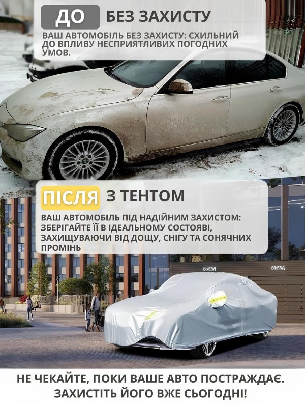 Вулична накидка від сонця захищає лакофарбове покриття від подряпин, частих миттів і перефарбовування. Чохол стійкий до пилу та вологи, а якщо він правильно підібраний за розміром, його кріплення по периметру надійно утримають його на кузові автомобіля, не даючи вітру зірвати його. Матеріал тента водовідштовхувальний з гладкою зовнішньою поверхнею.